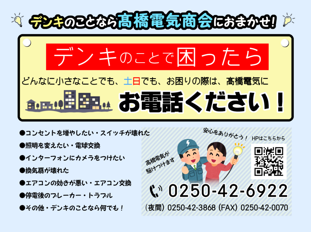 休み等(日曜日、土曜日)でも髙橋電気商会は仕事をしていることがあります。お客様がお困りの場合はお電話ください。